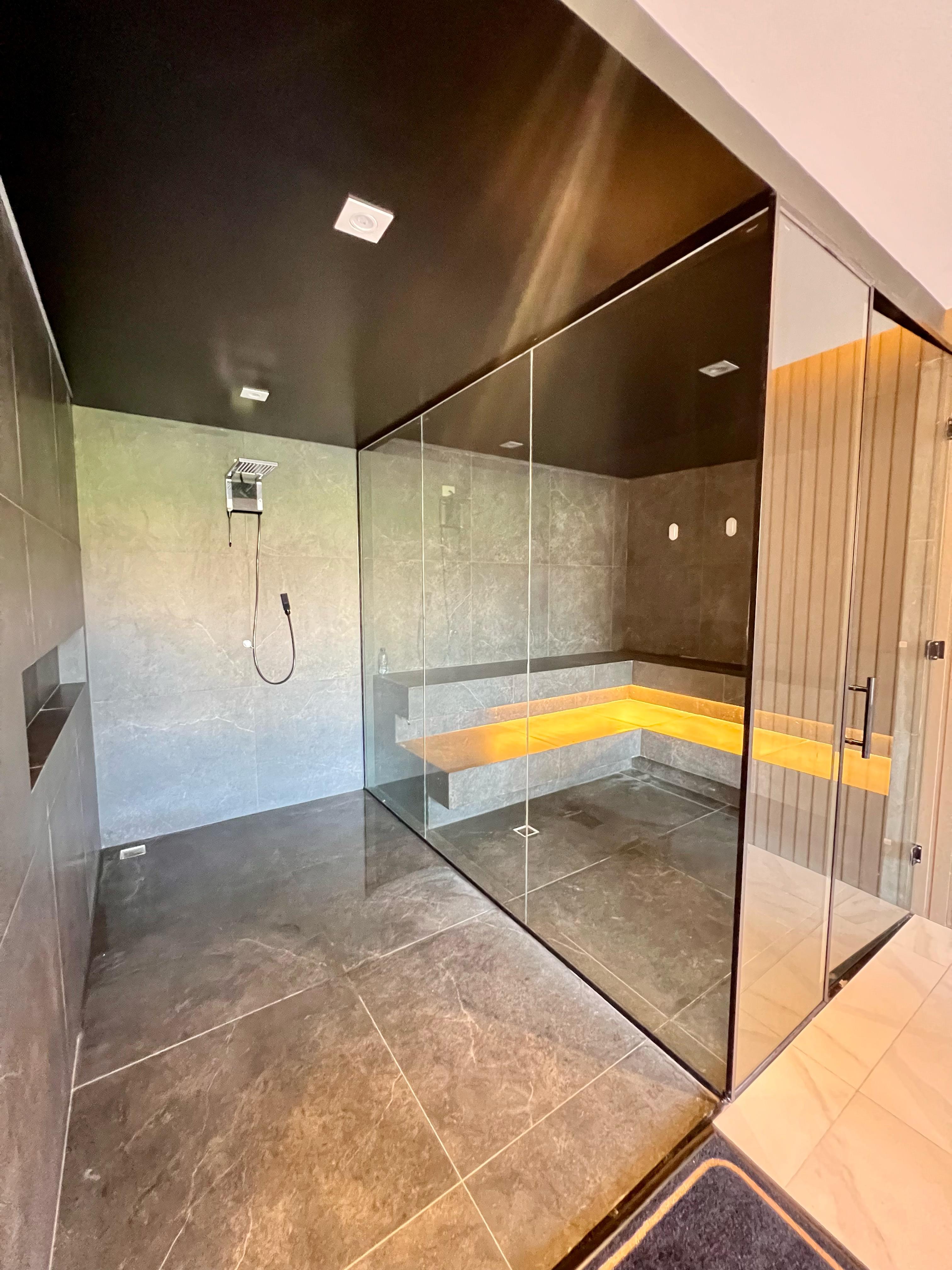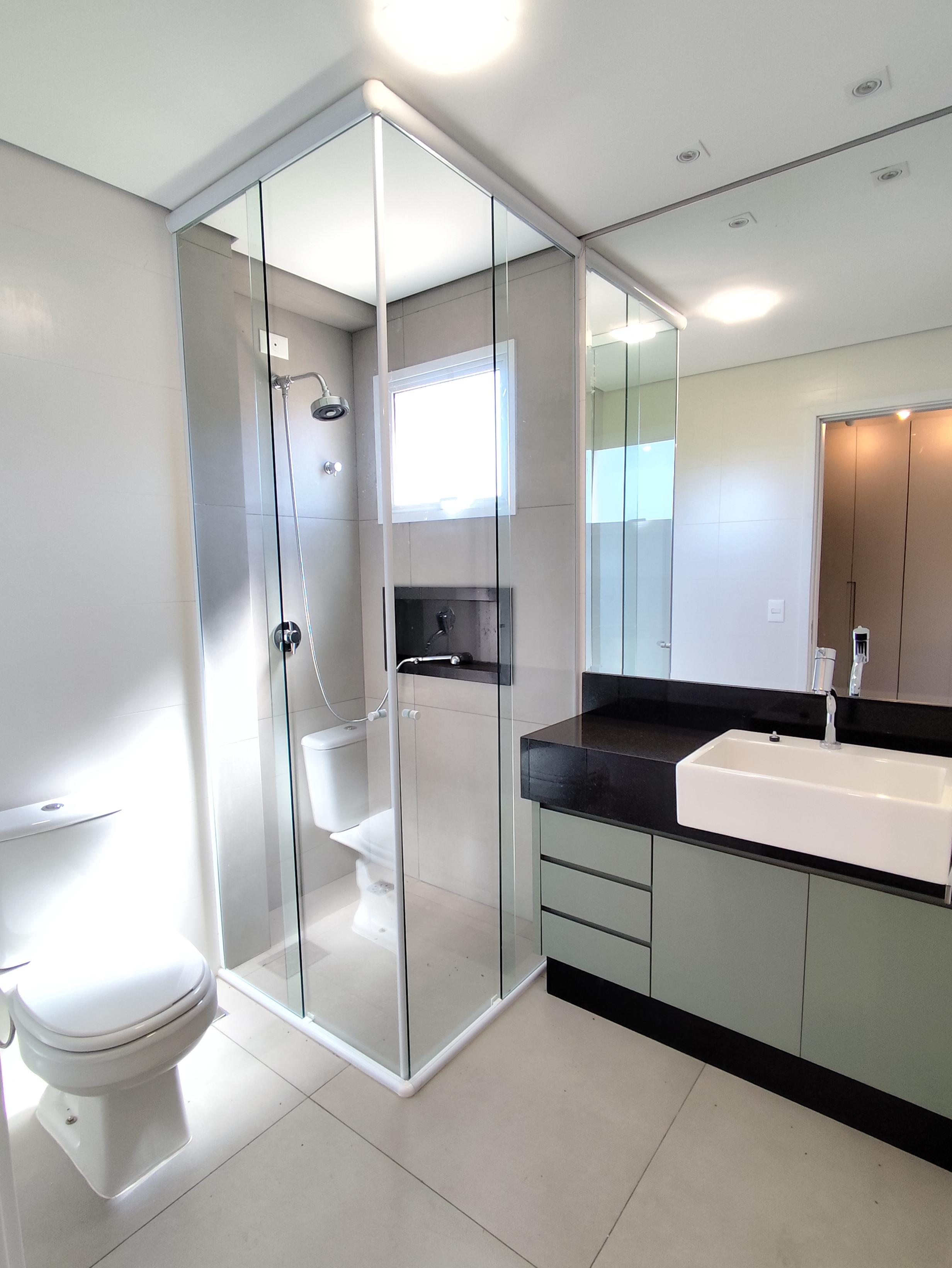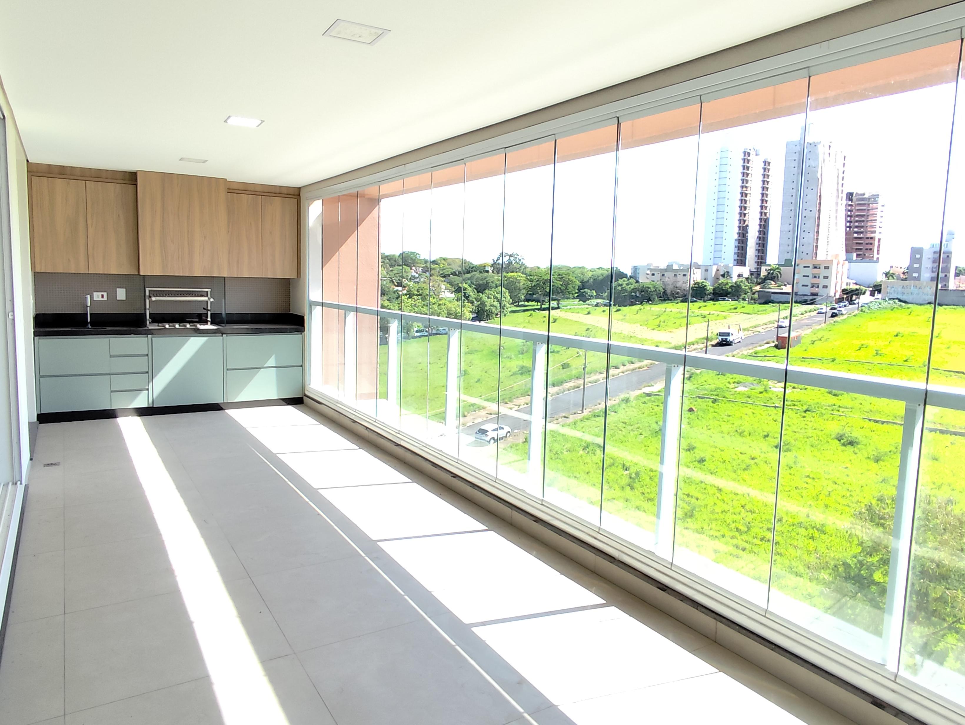 Sacada gourmet com churrasqueira, armario e fechamento em vidro.