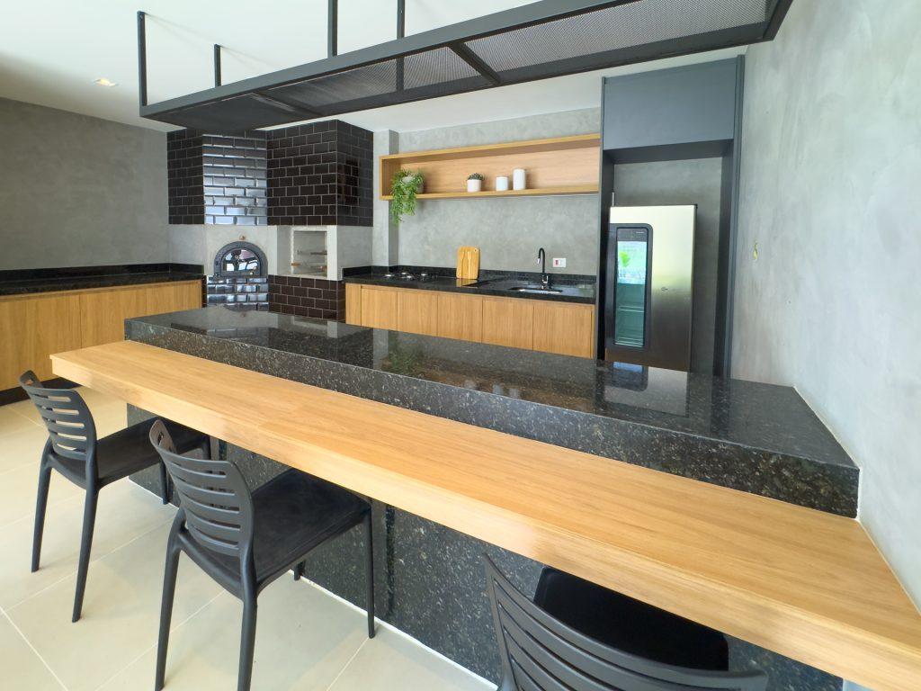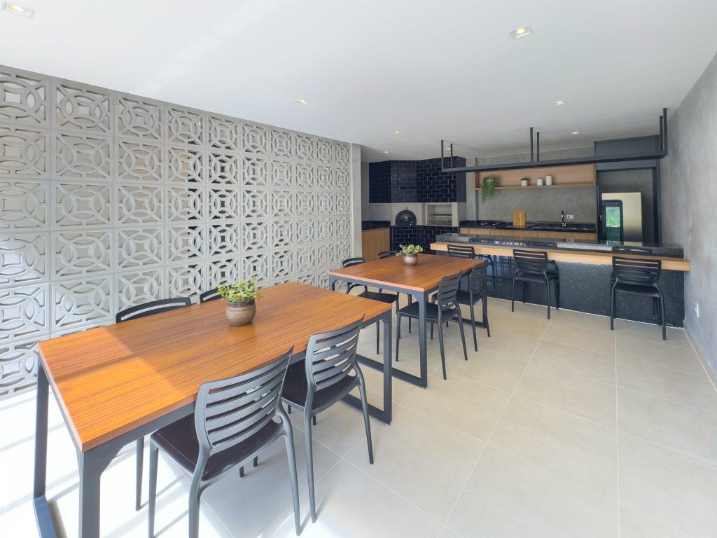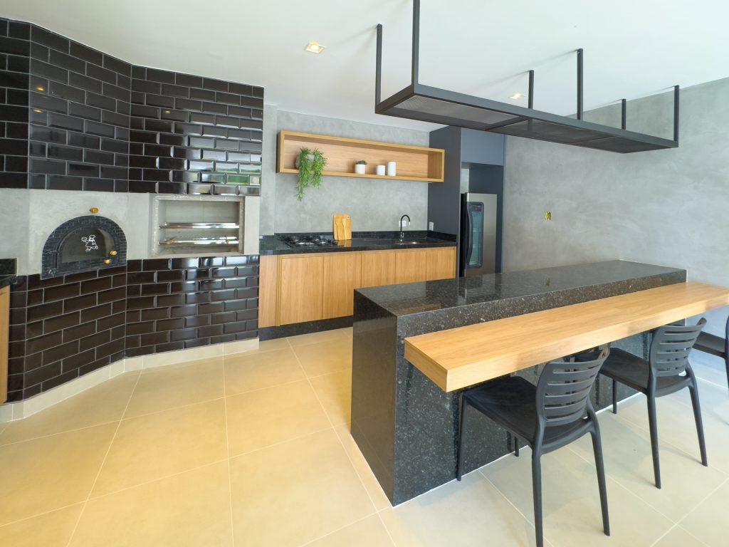 sala de estar, cozinha planejada com armários embutidos, cooktop e depurador de ar, banheiro social, lavabo, área de serviço conjugada com a cozinha, sacada gourmet com churrasqueira a gás e 01 vaga de garagem.
