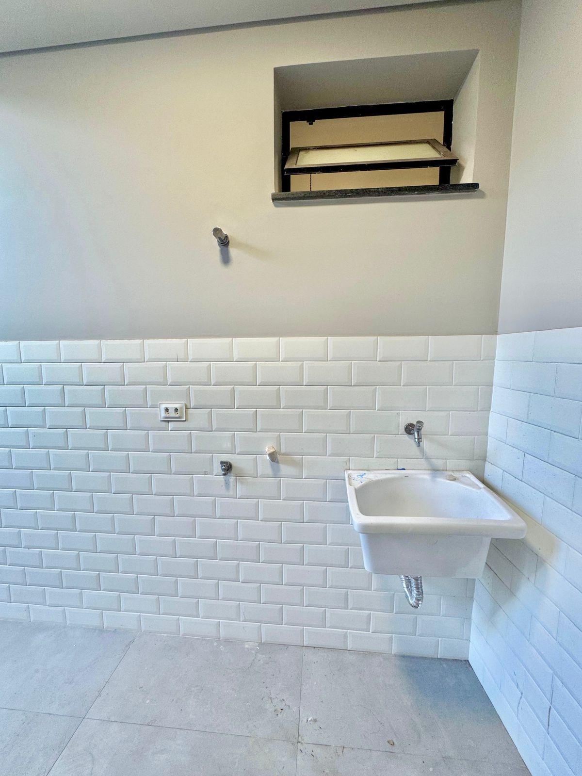 Fundos com chuveirão, pia com armários, churrasqueira e banheiro.