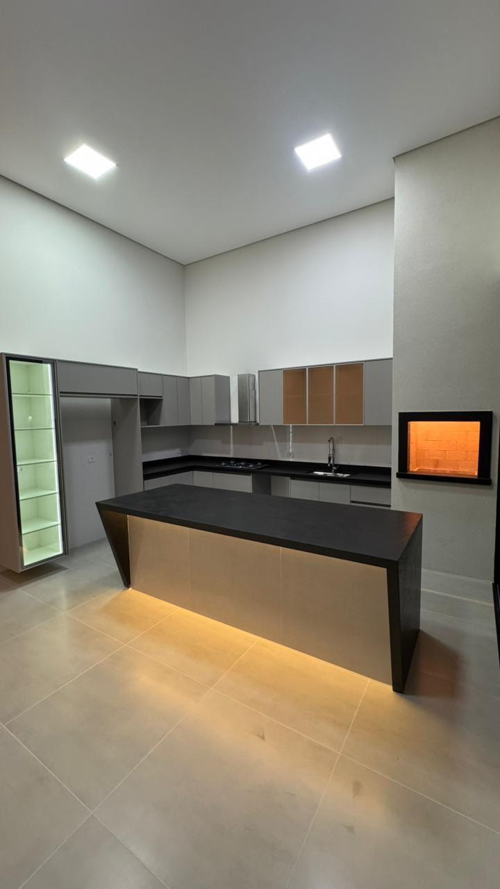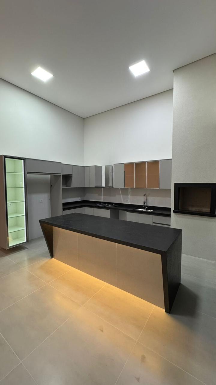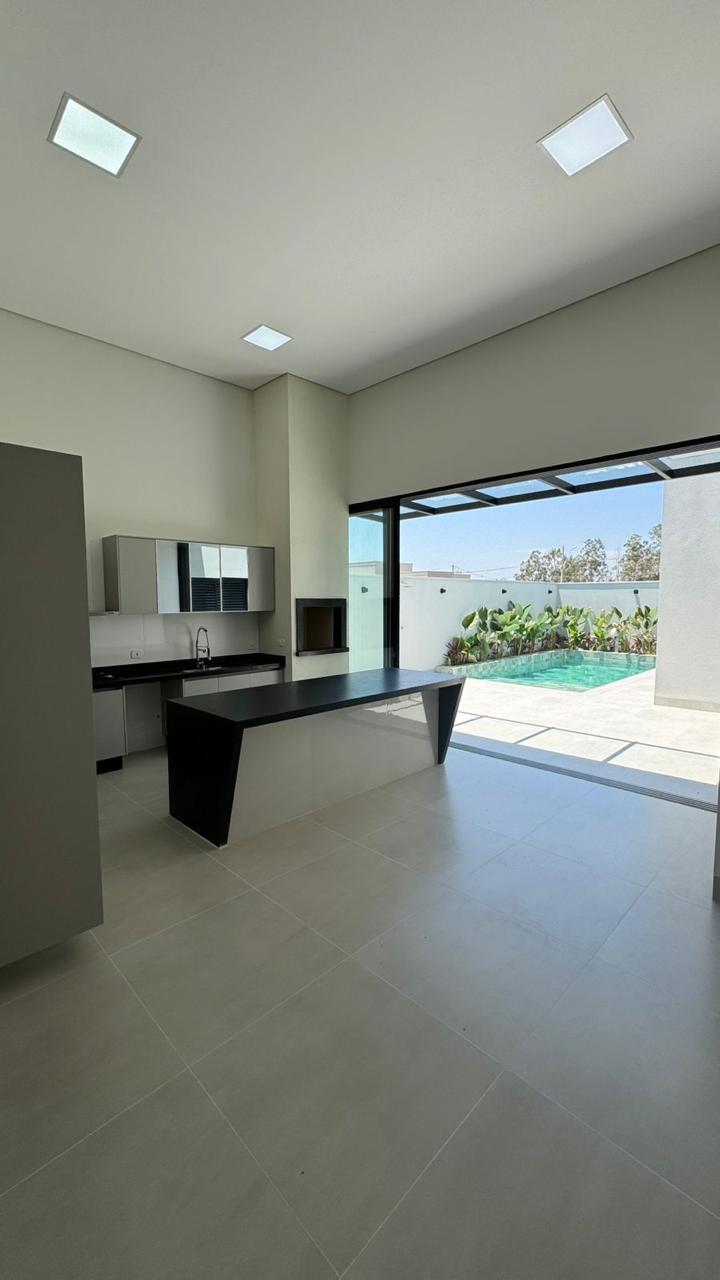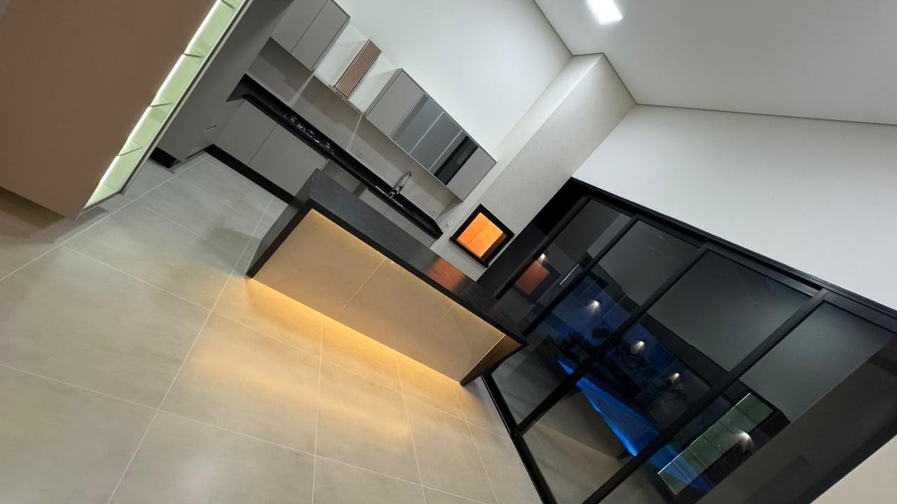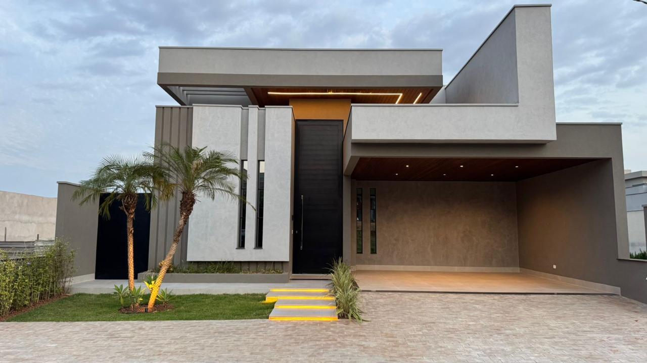 Casa Térrea no Condomínio Portinari II em Presidente Prudente/SP, com 3 suítes (sendo 1 master com closet e banheiro com cuba dupla e chuveiro de teto), sala de TV e jantar com pé-direito alto, escritório, lavabo, despensa, cozinha gourmet com móveis planejados, cristaleira e balcão em mármore preto São Gabriel. Possui lavanderia planejada, energia fotovoltaica, piscina aquecida com prainha, hidro e cascata, além de ótimo espaço de quintal. Garagem coberta para 2 veículos, acabamento de excelência, isolamento térmico e acústico, iluminação em LED e fachada moderna.